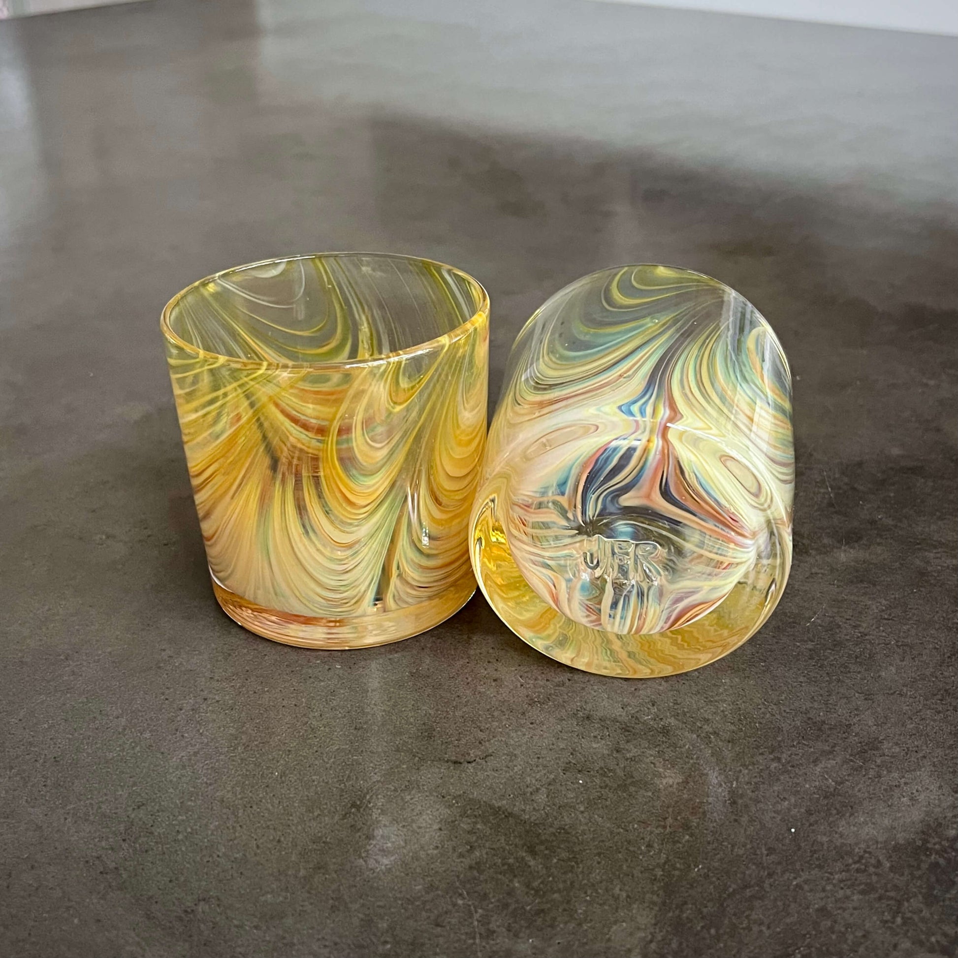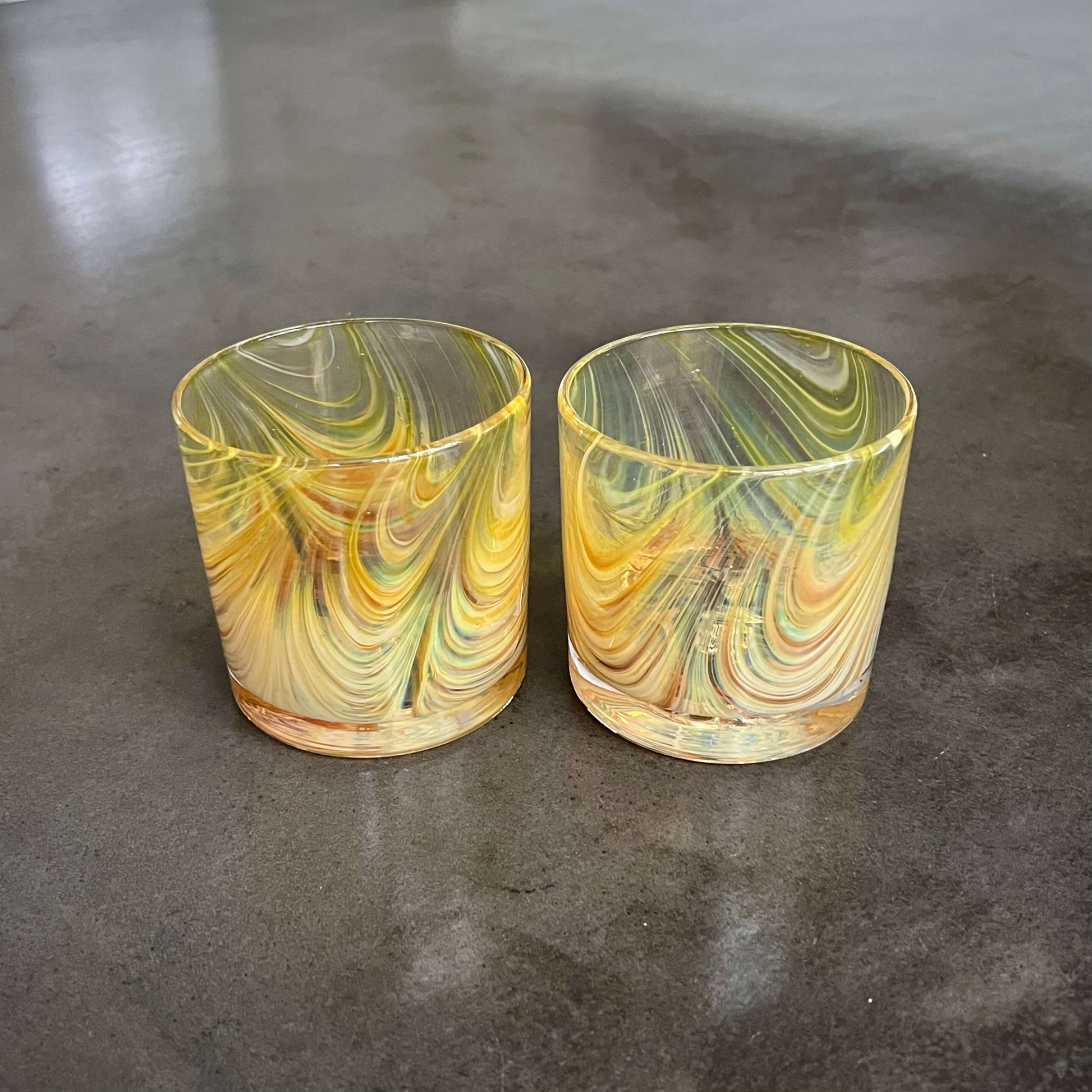 Select German glass colors are applied and pulled to bring to life the beauty of wood-grain in this classic rocks glass. Notice how the color of the glass transforms based on light through reflection & refraction! The color is added to the cup while it's hot, so it will not chip or peel.